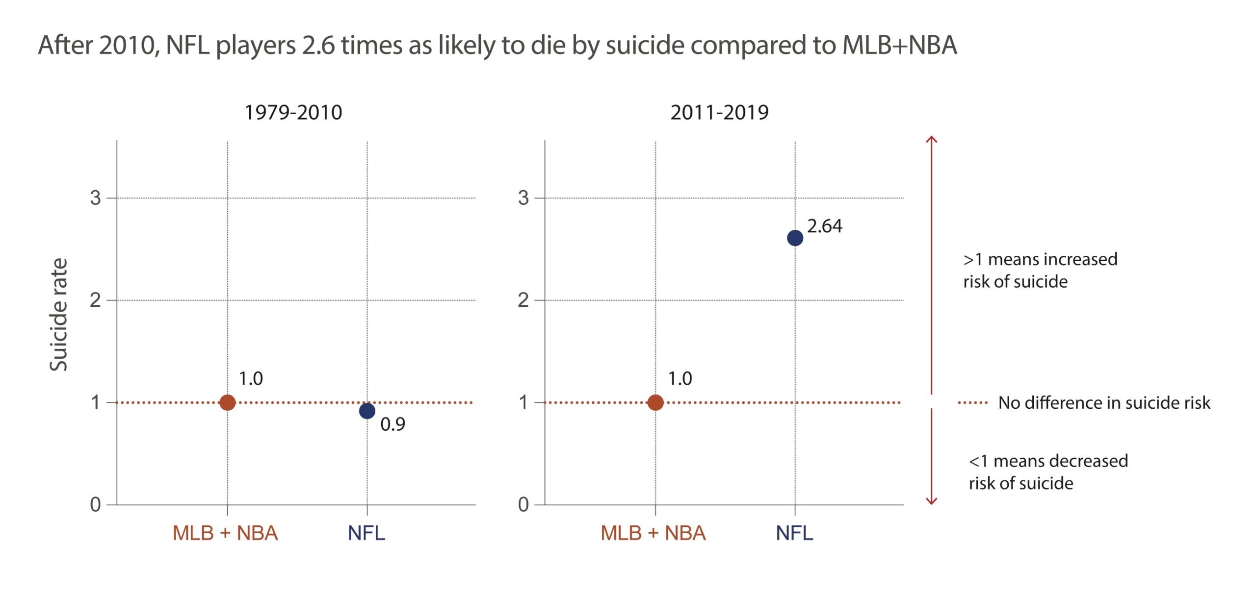 - In contrast, during the time period between 2011-2019 we saw a 2.6-fold higher rate of death by suicide among NFL players when compared with the other two professional sports.